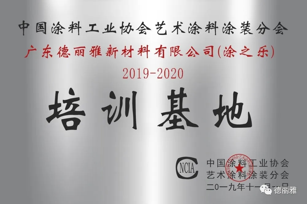 經(jīng)過中國(guó)涂料工業(yè)協(xié)會(huì)藝術(shù)涂料涂裝分會(huì)的全面考察,2019年十一月,廣東德麗雅新材料有限公司(涂之樂)已獲評(píng)為中國(guó)藝術(shù)涂料培訓(xùn)基地,通過在我司參加藝術(shù)涂料培訓(xùn),可獲得國(guó)家級(jí)墻藝師證書